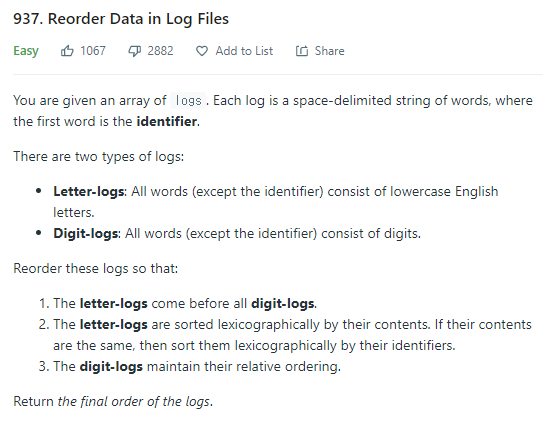 Leet Code 937번 로그파일 재정렬이다. 단순히 문제를 읽었을 때 파악하지 못한 개념이 있었다. 문제를 읽다 보면 하단의 2번 항목에 "lexicographically"라는 단어가 나온다. 찾아보니 "사전식 순서"라는 뜻이라고 해석된다. 즉 문제에서 요구하는 바가 정렬하는 내용이 같을 경우 식별자를 통해 사전식 순서로 정렬을 하라고 요구하는 것이다.