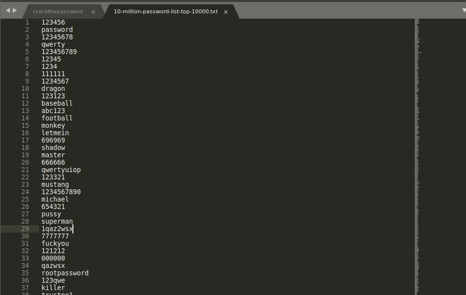 10-milion-password-list-top-10000.txt 는 패스워드 사전이 저장된 파일입니다 crackthepassword 위의 예제로 쓴 내용이 들어가있는 파일명 입니다.