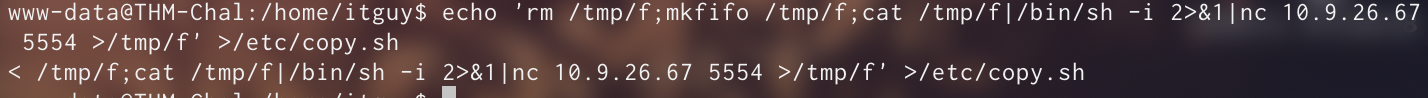 해당 내용은 reverse shell connect을 맺는 녀석으로 보입니다. 해당 내용에서 ip와 port 번호를 자신의 환경에 맞게끔 세팅하고 echo 명령어를 이용해 덮어씌워 줍시다.