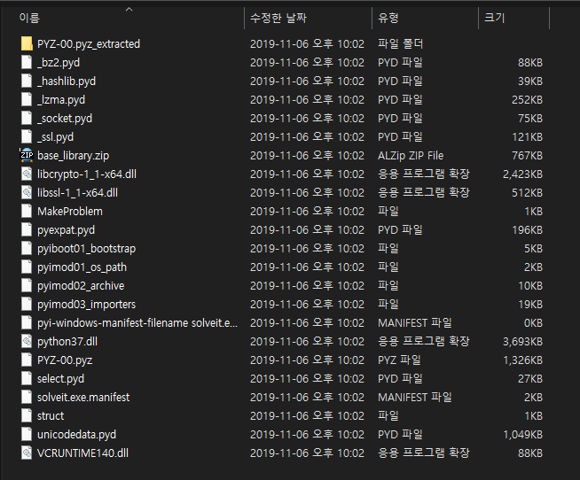 생성된 solveit.exe_extracted의 폴더는 다음과 같은 파일과 디렉터리를 가지고 있습니다.