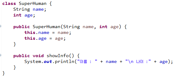 멤버 변수는 "이름" 과 "나이", 생성자를 통해 이름과 나이를 받는 것을 알 수 있고, showInfo() 메서드로 멤버변수의 값을 출력하고 있습니다.