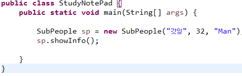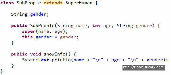 자식 클래스인 SubPeople은 멤버변수로 gender를 받고 상속을 통해 물려받은 showInfo() 메소드를 오버라이딩 시키는 것을 알 수 있습니다.