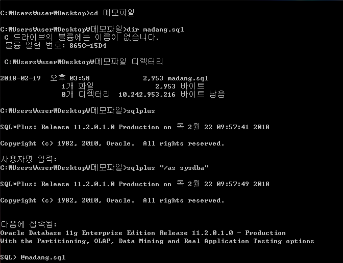 madang.sql 파일이 위치한 곳으로 경로를 이동하고 후에 sqlplus "/as sysdba"로 접속한 뒤 @madang.sql 명령어로 madang.sql 파일에 있는 정보가 등록이 됩니다.
