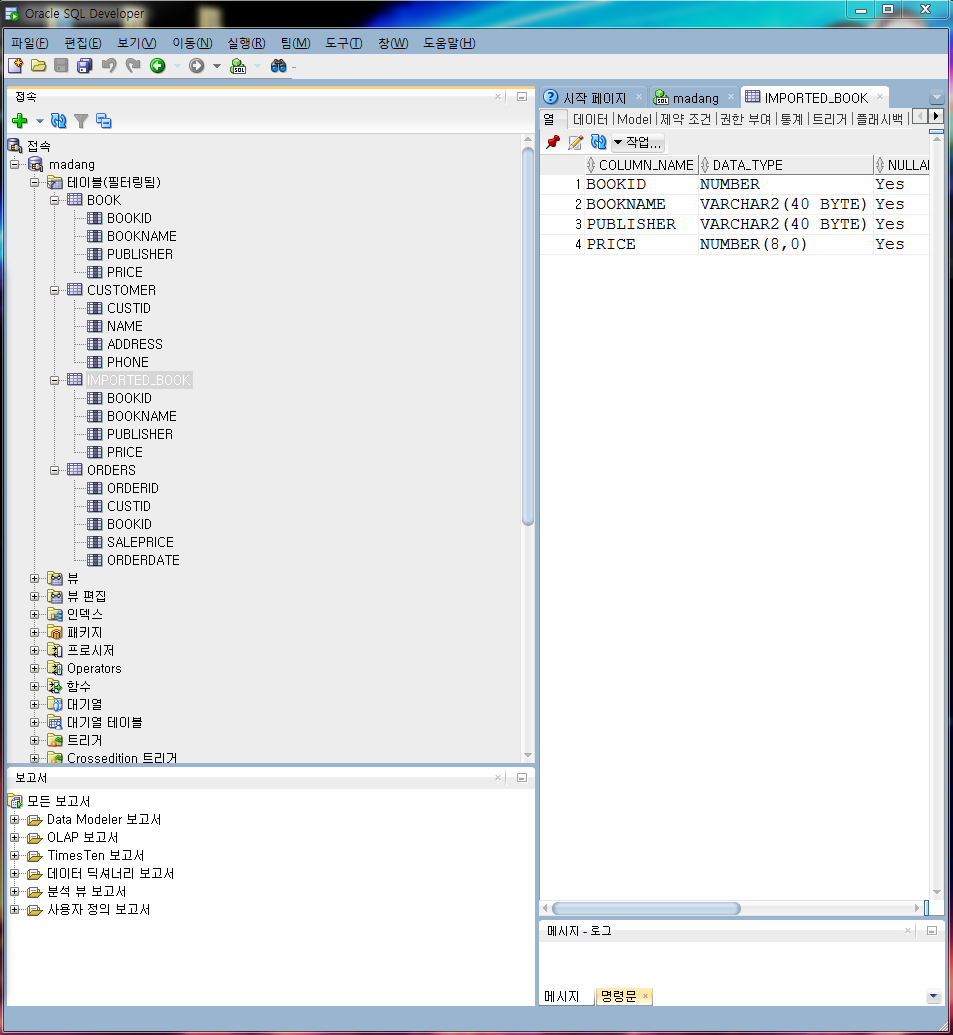 위에 테이블은 "오라클로 배우는 데이터베이스 개론과 실습"의 sql 파트인 madang 서적을 테이블로 작성해놔서 madang이라는 테이블 목록이 보이지만 아마 처음 설치하시게 되면 아무것도 없는 목록이 보일 것입니다.