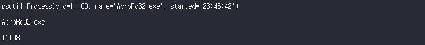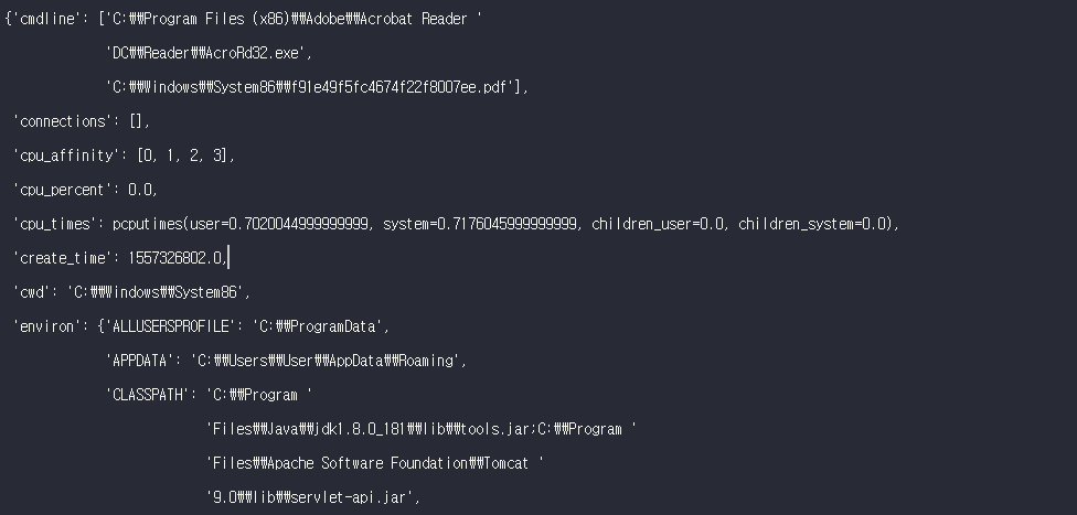 AcroRd32.exe 관련 pid를 이용해 Process 정보를 얻어오고 .as_dict() 를 이용해 관련 프로세스의 자세한 정보를 얻어올 수 있습니다.