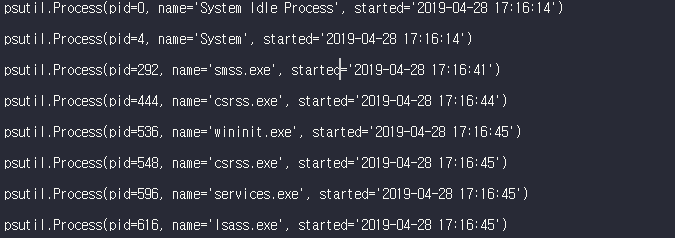 process_iter()는 현재 실행되고 있는 process의 정보를 iterable 하게 변환해줍니다. 각각의 process 정보를 for문으로 print 하면 다음과 같은 결과가 나옵니다.
