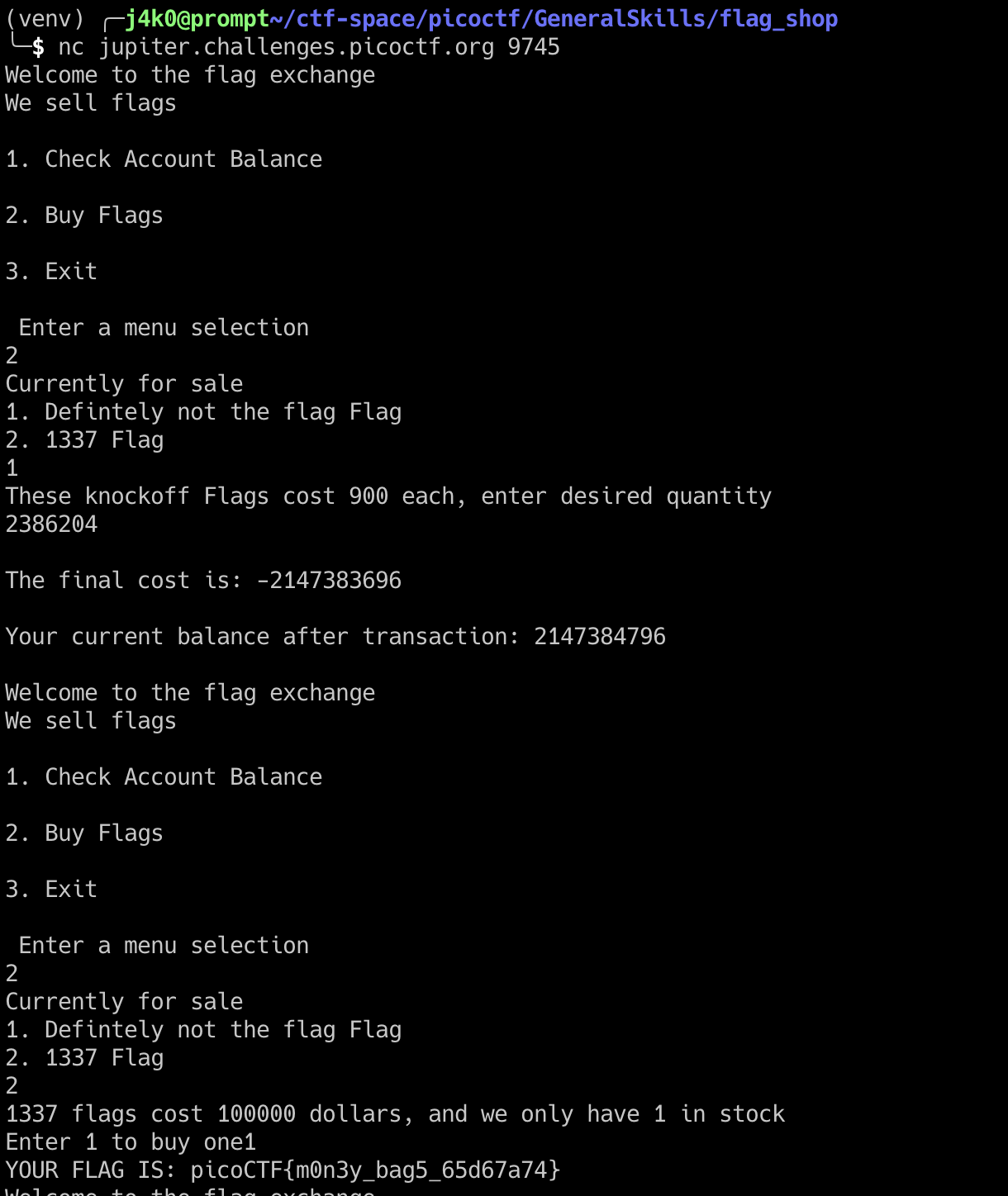 즉 account_balance - (-total_cost)의 값이 integer overflow를 이용해 100,000 보다 큰 값으로 초기화 시키는 number_flags 값을 입력