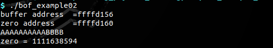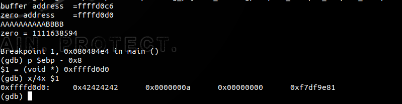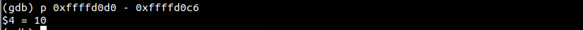 맨 앞부분에서 언급했듯이 10바이트를 넘어 입력하면 zero 변수가 바뀌었습니다. gdb로 확인해본 결과 위의 zero 변수와 buffer 변수의 차이도 10바이트가 나는 것을 확인할 수 있습니다.