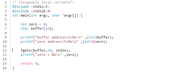 목표는 buffer변수를 오버플로우 시키면 zero 변수의 값이 변하는지 관찰하는 것으로 시작했습니다. 소스 코드의 실행 결과 buffer 변수의 주소와 zero 변수의 주소가 출력되기 때문에 gdb를 통해서 zero 변수의 값을 바꾸려면 buffer 변수를 몇 바이트를 overflow 시켜야 되는지 알아보고자 합니다.