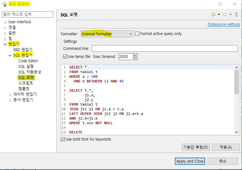 이를 해결해보고자 구글링 좀 해본 결과 DBeaver의 SQL Fomatter을 사용자가 지정할 수 있는 기능이 존재한다는 걸 알게되었다.