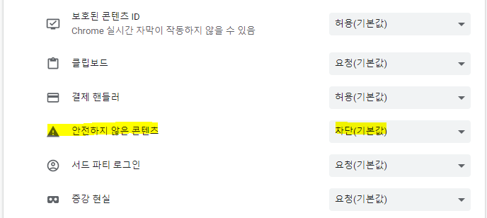 - 이후 아래로 스크롤한 뒤 다음과 같이 안전하지 않은 콘텐츠를 차단을 허용으로 바꿔주자
