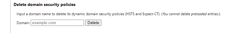 처음에는 chrome에서 HSTS 설정이 잡혀서 데이터 전송이 안 되는 건가 싶어서 chrome의 설정을 건드려보기로 했다. 방법은 크롬의 url 입력창에 chrome://net-internals/#hsts를 입력하면 아래와 같은 화면이 나올 텐데 Delete domain Security polices 항목을 찾아서 HSTS 적용 해제할 도메인을 입력해서 삭제하면 된다.