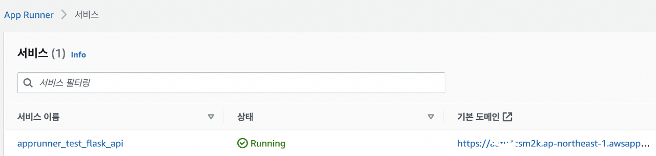 이후 하단에 “다음”이라는 버튼을 통해 App Runner를 사용하면 됩니다. 몇 분 정도 거치면 “App Runner > 서비스”에서 App Rrunner가 실행 중인 것을 확인할 수 있습니다