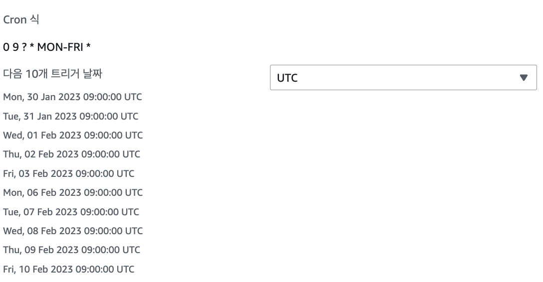 cron(0 9 ? * MON-FRI *) # 9시는 GMT이며 한국시간으로 오후 6시