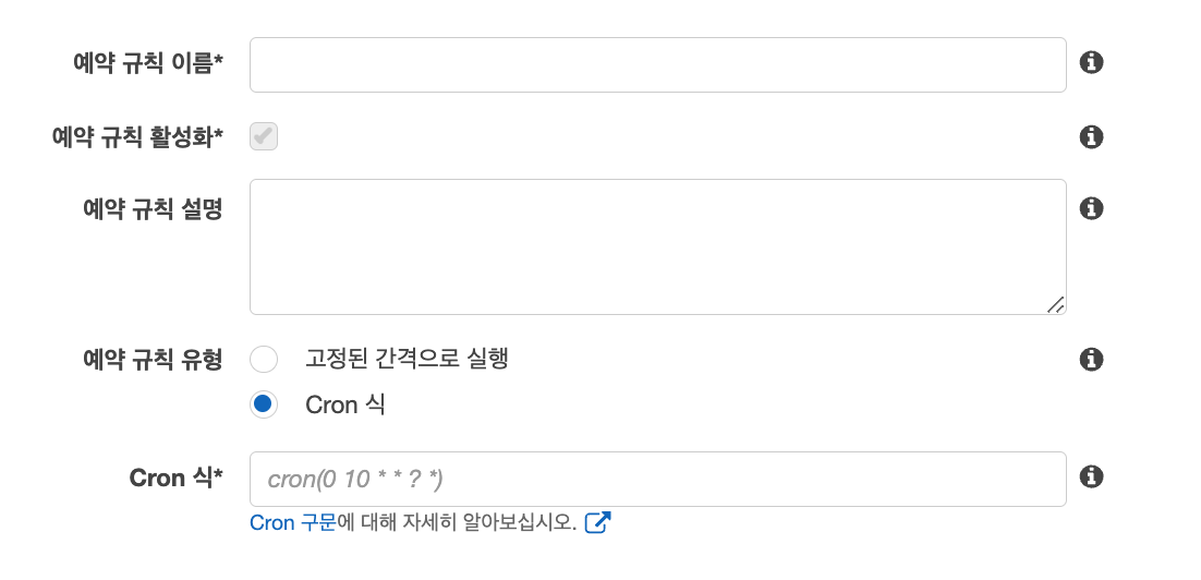 제 경우엔 cron 식을 이용했는데 주의할 점은 AWS의 Cron 식은 GMT를 기준으로 합니다. 즉 한국에서 실행하기 위해서는 시간대를 맞춰주는 작업이 필요합니다. 저는 편의를 위해 https://savvytime.com/converter/gmt-to-kst에서 시간대를 참고하여 적용했습니다.