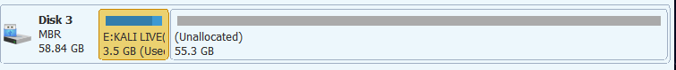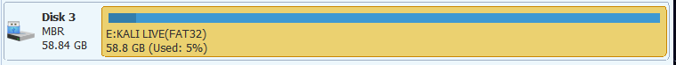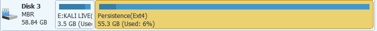 위의 사진처럼 58GB(원래는 64GB)의 USB를 두 개의 파티션으로 나눈 뒤 하나는 부팅 가능한 Live ISO를 받고 다른 하나는 Persistence 로 쓸 분 만큼의 용량을 나누게 됩니다(뒤에서 설명). 이렇게 64gb를 USB를 써도 실제 용량은 58gb로 6GB 정도가 날아가니 USB 용량 64gb를 써도실제론 58gb에 해당하는 용량을 써야 되네요