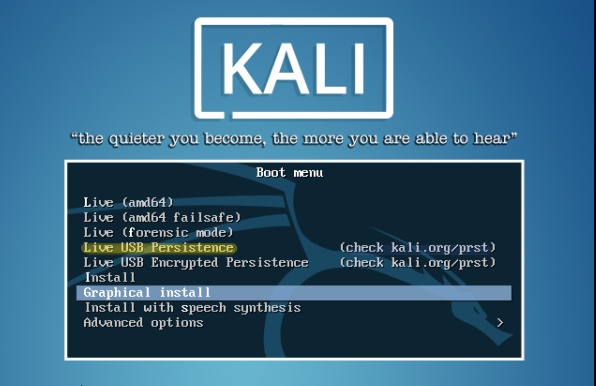 두 번쨰 방법은 KALI LINUX의 Persistence 기능을 이용하는 것입니다. 이 방법은 컴퓨터 OS 진입전 Booting 단계에서 USB에 설치된 Kali Linux로 이동 시키는 것을 가능하게 합니다.