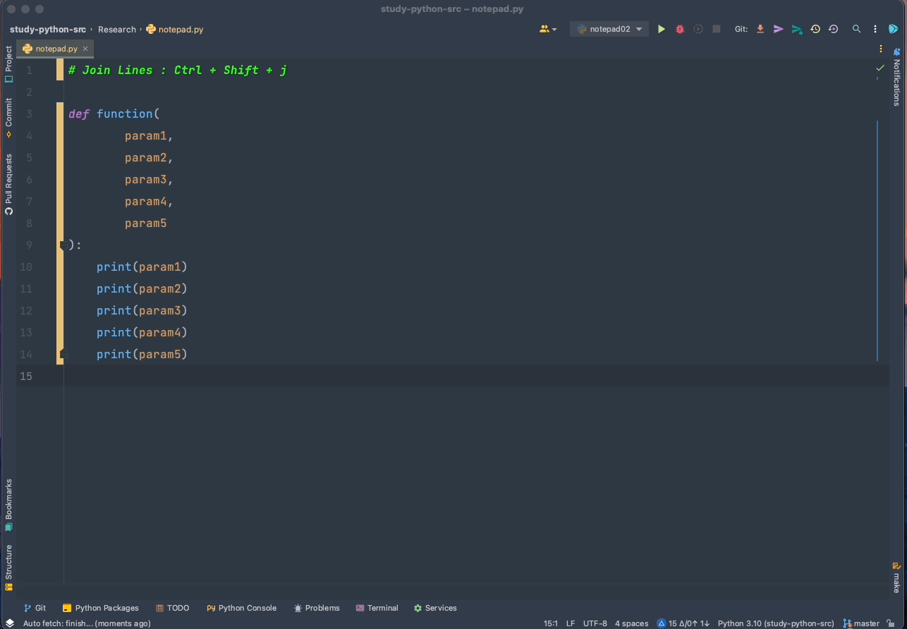 먼저 pycharm에서 특정한 plugin을 설치하지 않고 사용할 수 있는 단축키입니다. 쉼표로 구분된 라인을 한 줄로 만들 때 유용하게 썼습니다. 아래는 실행 전후로 적용된 결과입니다.