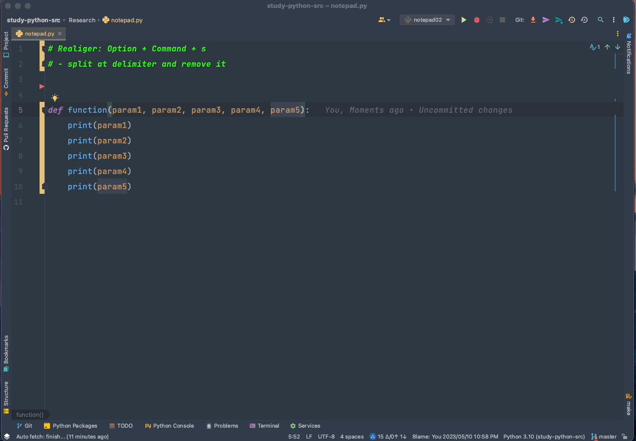 Pycharm의 Comma Section Mode는 Multi Row를 복사한 뒤 붙여 넣기 할 때 많이 사용합니다. 주로 사용했던 상황은 미리 지정된 변수를 함수의 인자로 넘길 때 유용하게 사용했습니다.