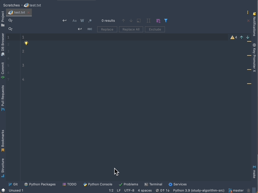 추가로 pycharm에서 비어있는 행을 지우고 남아있는 내용을 위쪽으로 병합하는 방법입니다. 이는 단축키나 Plugin을 찾진 못했습니다. 방법은 replace with 기능중 정규표현식 필터를 이용해 수행할 수 있습니다. 저는 이 방법을 주로 메서드명이나 클래스명을 문서로 옮겨야 할 떄 자주 사용하곤 합니다.