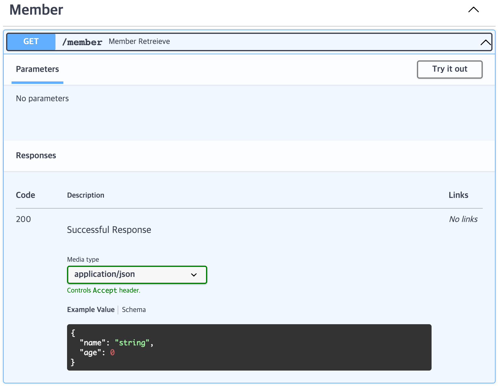 이 코드의 결과는 FastAPI의 문서를 통해 확인하면 다음과 같이 노출된다.