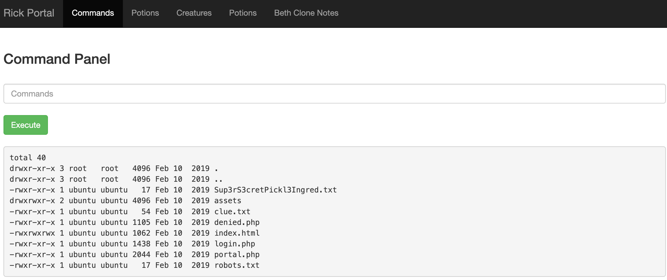 This Rick and Morty-themed challenge requires you to exploit a web server and find three ingredients to help Rick make his potion and transform himself back into a human from a pickle.