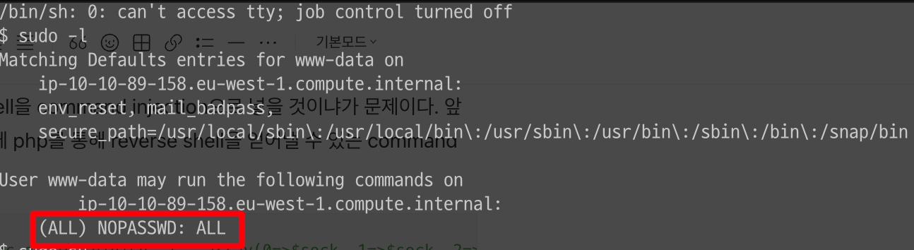대상 시스템의 shell을 획득했기 때문에 문제에서 요구하는 text를 찾기만 하면 된다. 하지만 아직 root 권한을 얻지 못했음으로 root 권한을 얻어보자. 가장 간단한게 접근하는 방법은 "sudo -l"이다.