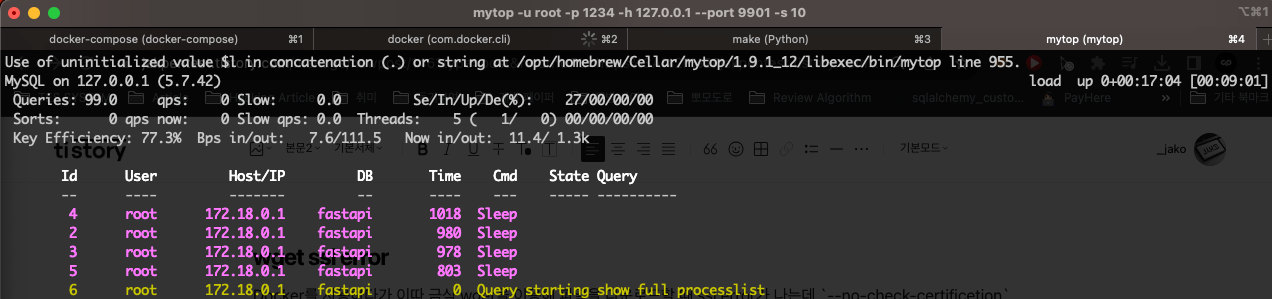 mytop은 특이하게 remote로도 실행이 가능했는데 mysql container가 구동되어 있는 경우에 다음과 같이 실행할 수 있다.