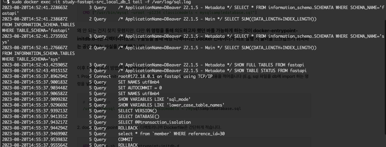 위의 docker-compose.yml에 SQL Logging을 위해 추가된 옵션을 보면 단순히 log 파일의 위치를 변경한 것뿐이다. 이제 아래와 같이 docker 명령을 이용해 SQL Logging을 할 수 있다.