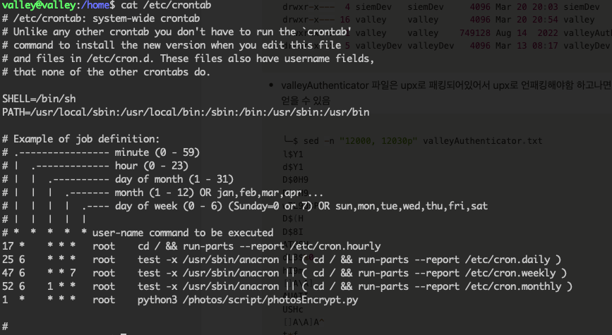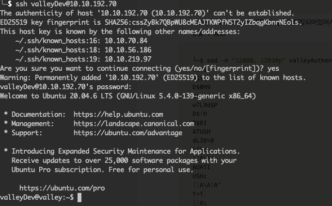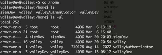 /home 디렉터리에는 각 계정에 대한 디렉터리 외에도 valleyAuthenticator라는 파일이 추가로 확인된다. 현재 로그인된 쉘은 특정 명령어 실행에 대해 제한되어 있으니 valleyAuthenticator라는 파일을 로컬로 옮겨와서 분석해 보자. 가장 간단한 방법은 nc로 옮기는 것이다.