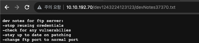 로그인에 성공했다. ftp server에 대한 노트처럼 보이며 credential을 재사용하지 말라고 되어있다.