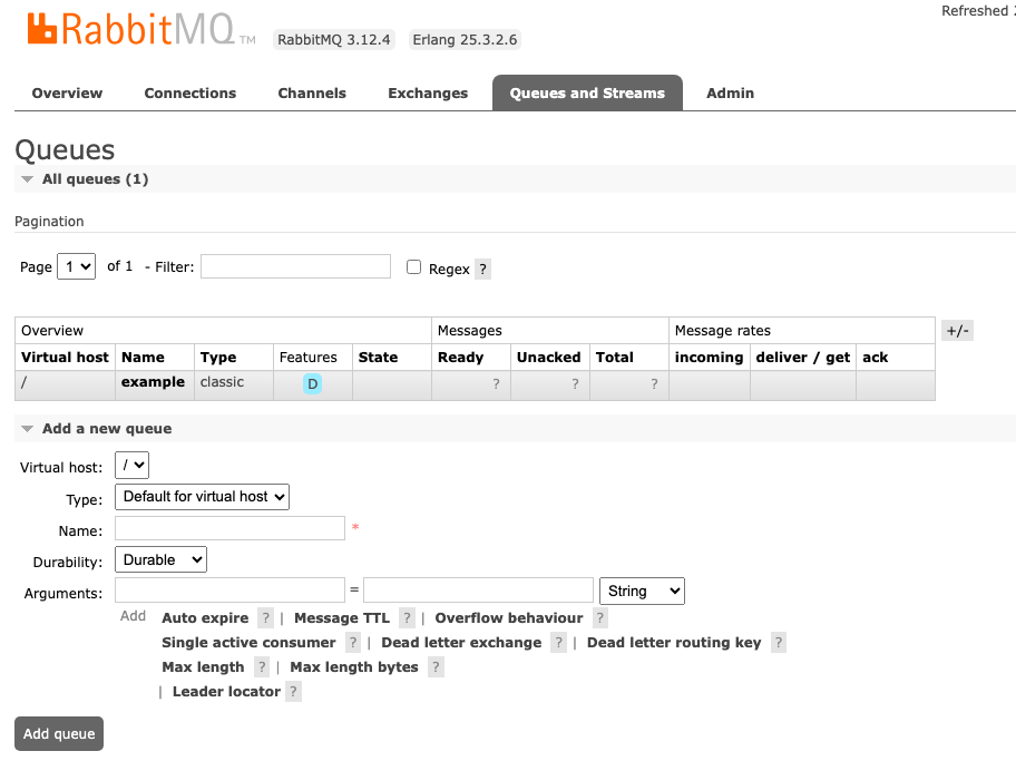 Exchange으로부터 받은 메시지를 저장하는 역할이다. "저장"되는 공간은 "디스크" 혹은 "메모리"로 선택할 수 있다.
