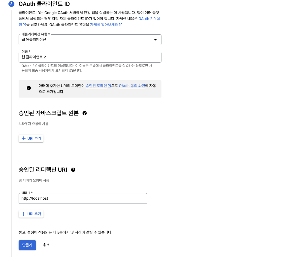 여기서 “사용자 인증 정보 만들기”를 클릭하여 API를 이용할 때 사용할 “계정”을 만들어봅시다. 이후부터는 필요한 데이터를 채우기만 하면 됩니다.