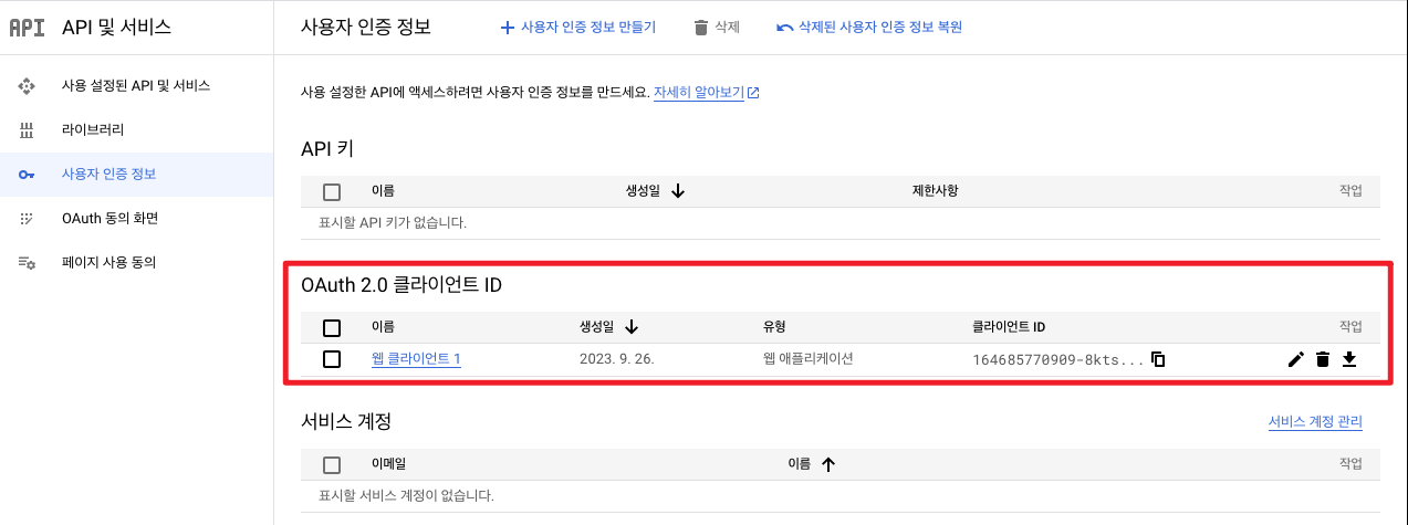 이 단계 이후 사용자 인증 정보에 대해 다운로드할 수 있는 부분이 나오며 해당 파일을 잘 보관해 둡시다.(편의로 인해 파일명을 “oauth_credential.json”로 변경함) 이 단계가 끝나 “사용자 인증 정보” 메뉴로 돌아오면 다음과 같은 항목이 생성되어 있습니다.