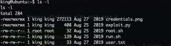 root 권한으로 실행하는 shell script 파일 2개가 보인다. root.sh 와 run.sh 이다. "/home/king"로 이동한 다음 root.sh를 root 권한으로 실행하니 이 파일에 reverse shell을 일으키는 코드를 심어주면 될 것 같다.