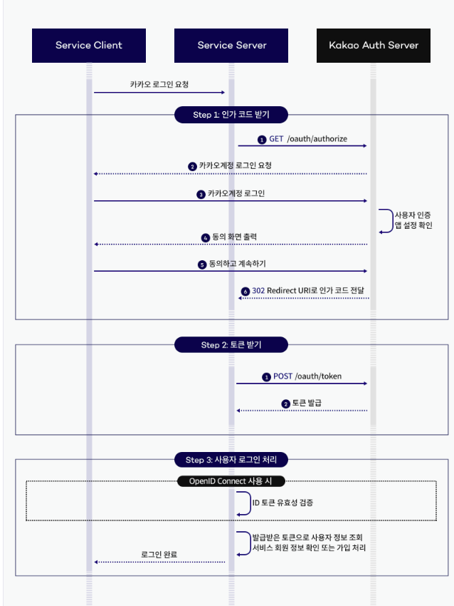제일 처음 진행해야 하는 건 KaKao API를 사용해 카카오 로그인(Oauth)을 하는 것이었다. 이 처리를 먼저 해둬야 나중에 Brunch에서 내 계정에 관련된 정보를 가져오는 Setting을 할 수 있기 때문이다. 카카오 로그인에 관한 가이드는 KaKao developers에서 친절히 설명하고 있다. 아래 이미지는 KaKao developers에서 설명하고 있는 카카오 로그인 과정이다.