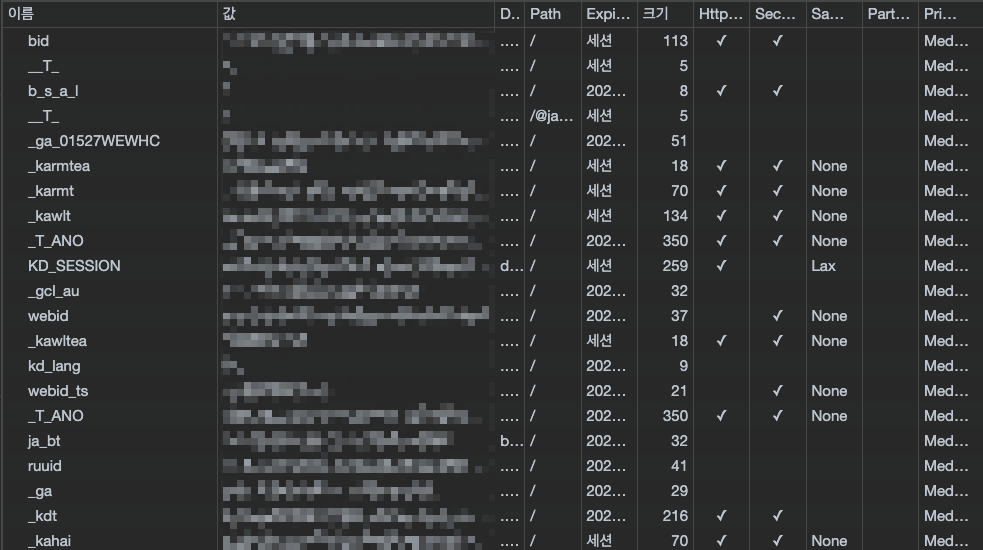 이제 이 token 정보를 어떤 방식으로 사용해야 할지 고민해야 할 때이다. Brunch에 로그인한 상태로 브라우저에서 "애플리케이션" 탭을 보다가 Cookie에 다음과 같은 정보가 있는 걸 확인했다.