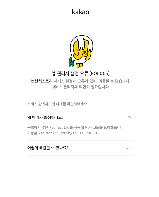 지금까지 파악한 내용대로라면 Brunch가 KaKao에 로그인 요청을 보내는 과정만 코드로 옮겨서 Local HTTPServer에 태우면 Local HTTPServer의 로그를 통해서라도 통신 관련 정보를 얻을 수 있을 것 같다. 하지만 아쉽게도 redirection_url 설정을 제어하지 못했다. KaKao OAuth 인증은 redirection_url이 등록되어 있는 주소와 일치하지 않으면 다음과 같은 에러가 표시된다.