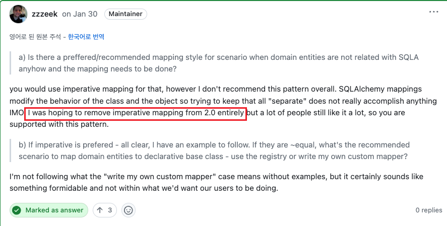 SQLAlchemy의 maintainer 개발자가 2.0에서는 제거하려고 했지만 많은 사람들이 사용하고 있기에 그러지 못했다를 언급하고 있다. 링크를 타고 들어가 Discussions을 살펴보면 "zzzeek"라는 개발자는 굳이 Class를 하나 더 만들어서 사용하는 것에 대해 실용성을 느끼지 못했다고 한다.