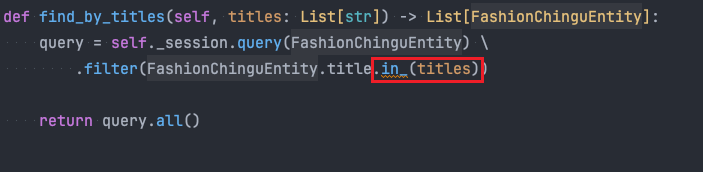 위에서 발생한 문제는 FashionChinguEntity는 dataclass로 정의된 속성이고 Python의 built-in type으로만 이루어져있기에 SQLAlchemy의 Column 객체에서 사용할 수 있는 in_() 메서드를 사용하려다보니 Type Hint에 대한 Warning이 발생하고 있다.