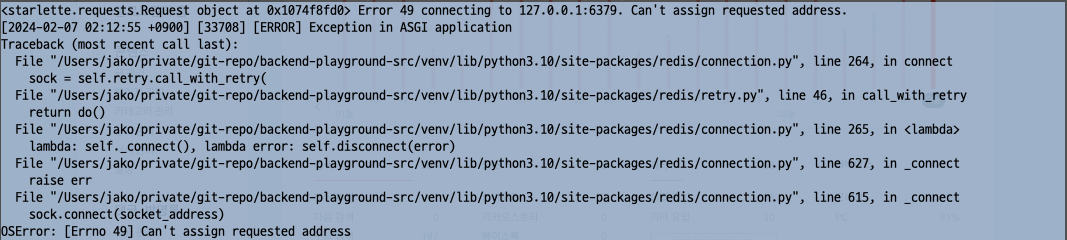 FastAPI에 Redis를 이용해 비동기 통신에 대한 성능 테스트를 시험 중이었다. locust에 Numbers of users는 1000 spawn rate는 100으로 설정하고 worker는 3개 정도를 주어 테스트 했다. FastAPI의 로그를 보고 있으니 다음과 같은 에러가 발생하고 있는 걸 확인했다.
