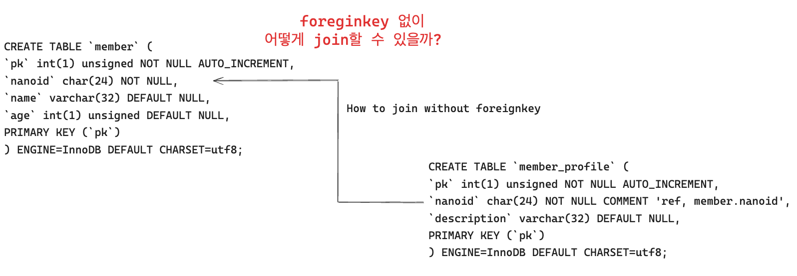 위 테이블에서 member_profile의 nanoid는 member의 nanid를 입력하는 column이지만 ForeignKey로 연관관계를 설정해놓지 않은 구조이다. sqlacodgen으로 Declarative Model을 생성하면 다음과 같다.