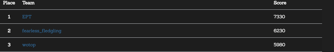 힌트 하나를 보게 되어 점수가 짝수 단위로 되어버려서 총 1614 point로 마무리됐는데 1등 팀은 무려 7330 point 였다.
