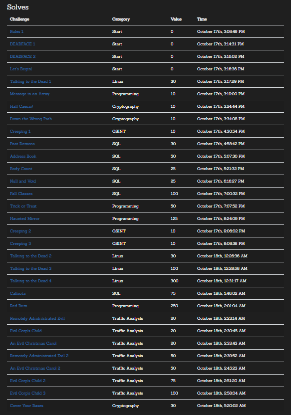 내가 푼 섹션은 LINUX, WEB, PROGRAMMING, Traffic Analysis, OSINT 였는데 풀지 못했던 섹션인 Steganography, Cryptography 같은 부분들은 ctftime.org에 WriteUp이 올라오면 읽고 공부해봐야겠다.
