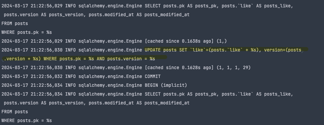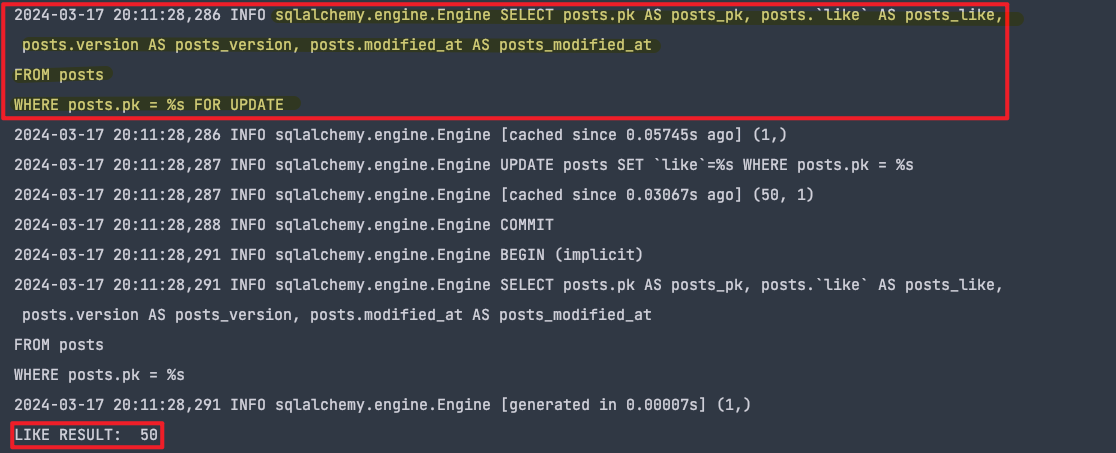 SQLAlchemy의 Query 로그를 살펴보면 실행된 SQL에 “FOR UPDATE”가 붙어있는 것을 확인할 수 있으며 like column의 결과도 각각 50인 것을 확인할 수 있다.