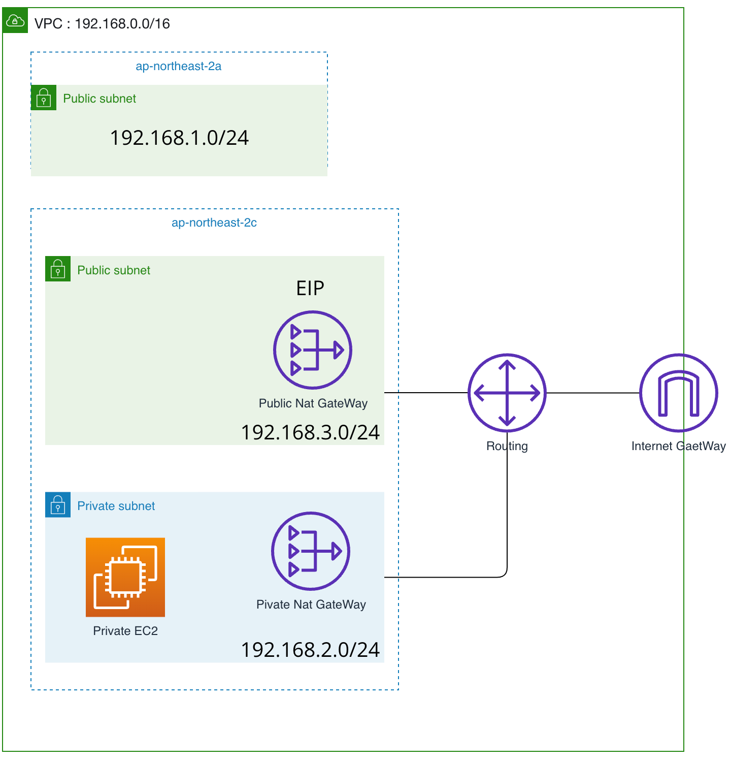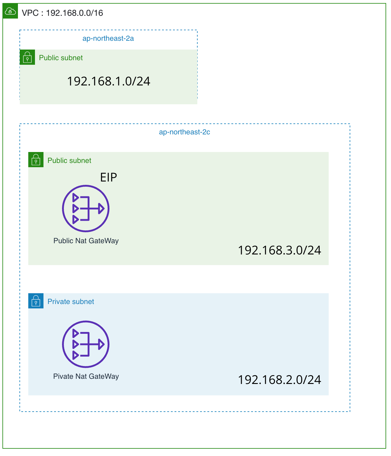 Private과 Public Nat GateWay까지 생성한 경우를 도식화를 통해 표현해 보자면 다음과 같다.
