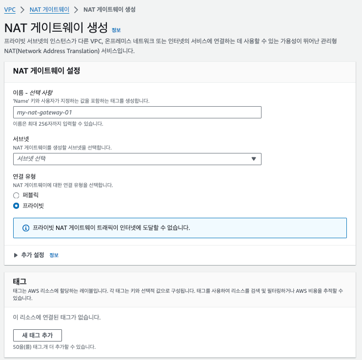Private Subnet에 연결할 Nat Gateway를 생성할 경우 연결 유형에 "프라이빗"을 설정하자.