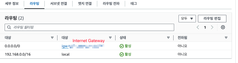 Public Routing Table은 0.0.0.0/0을 대상으로 송수신되는 요청을 internet GateWay로 향하게 설정해 주자. 물론 이때의 Internet Gateway는 앞서 생성한 VPC와 연결된 Internet Gateway를 뜻한다.
