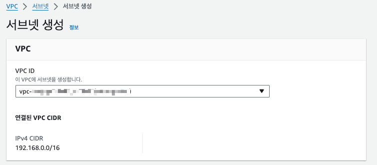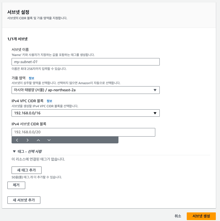 이제 생성한 VPC내에 위치할 Subnet을 생성할 차례이다. "VPC > 서브넷 > 서브넷 생성"을 통해 서브넷을 생성할 수 있다.