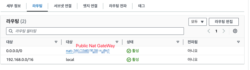Private Routing Table이지만 0.0.0.0/0 (모든 IP)를 대상으로 Public Nat GateWay를 향하도록 설정해 주자.